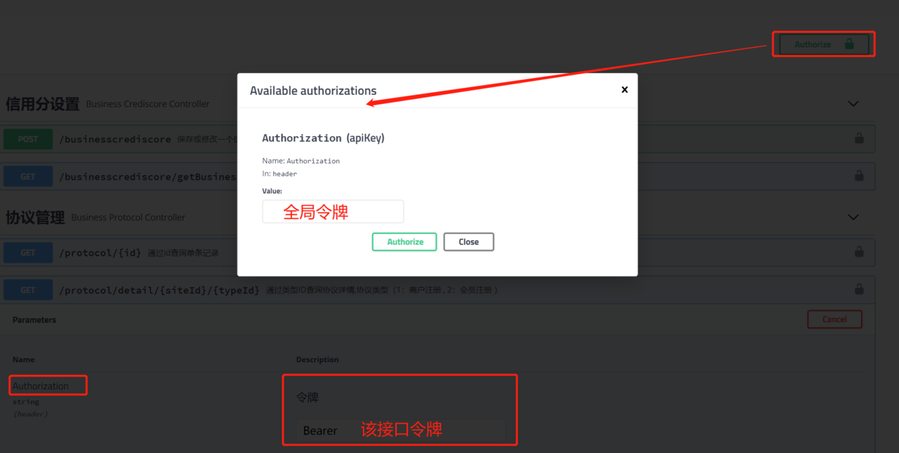 设置完成后进入SwaggerUI,右上角出现“Authorization”按钮,输入令牌对于除上文所述的包含auth的接口结果都会带上token。