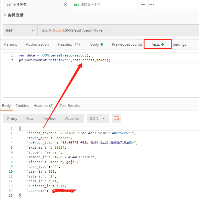 在登录请求写test Script脚本获取access_token设置环境变量token,参考官方API文档