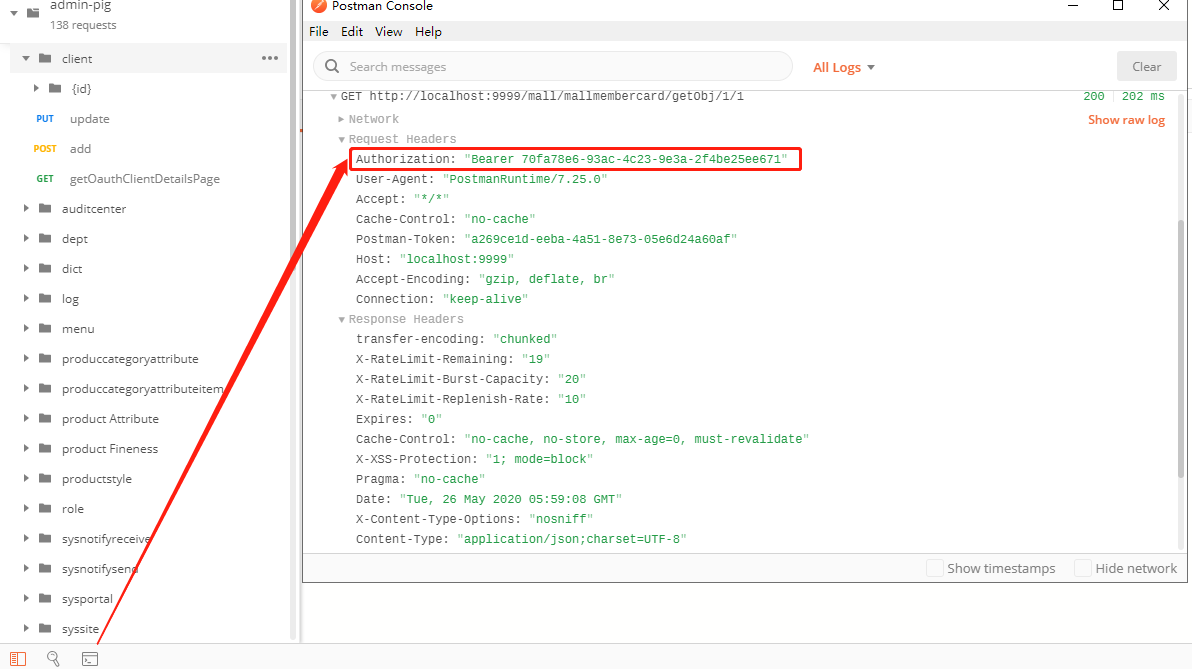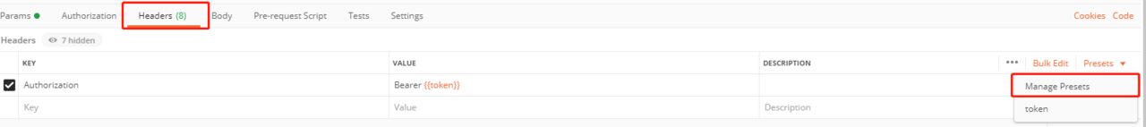 单次请求中一次性使用在Headers添加Authorization:Bearer {{token}};如果想复用token,在下图右下角红框点击Prese进入Manage Prese,header添加到Prese管理,在其他请求里选择是否使用该header(手动添加)。