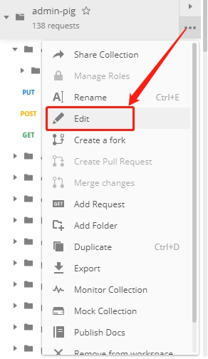 Pre-request Script全局Collections下所有请求使用该自定义请求头,右键Collections选择Edit进入编辑。