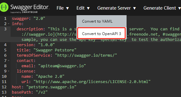 正确做法是通过swagger在线编辑器导入swagger文档,点击File选择import URL输入本地swagger url,导入成功点击Edit看见Cover to OpenAPI3,转化成openapi3后。