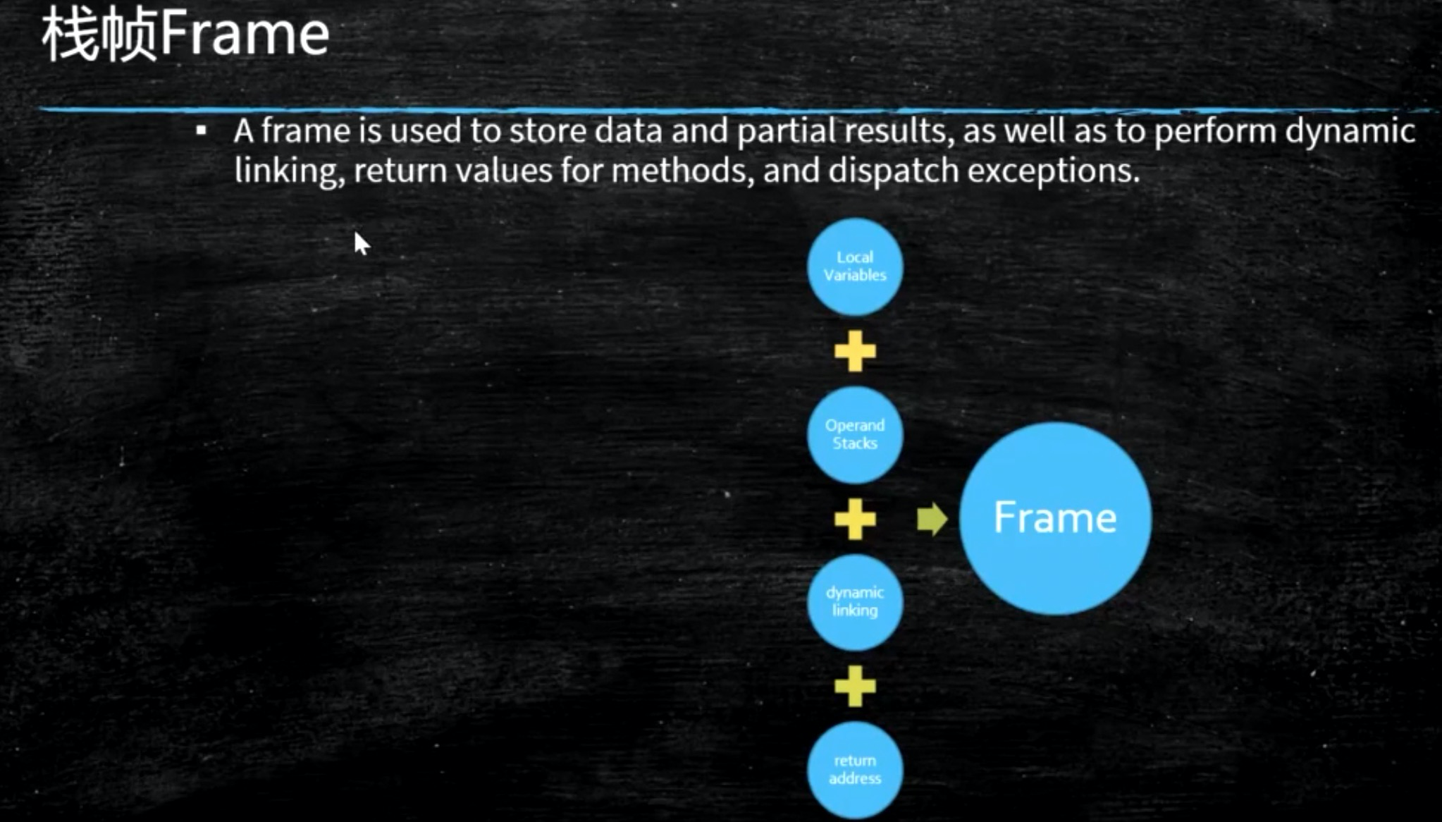 Frame(栈桢):用于存储局部变量表、操作数栈、动态连接、方法出口等信息。每一个方法被调用直至执行完毕的过程,就对应着一个栈帧在虚拟机栈中从入栈到出栈的过程。