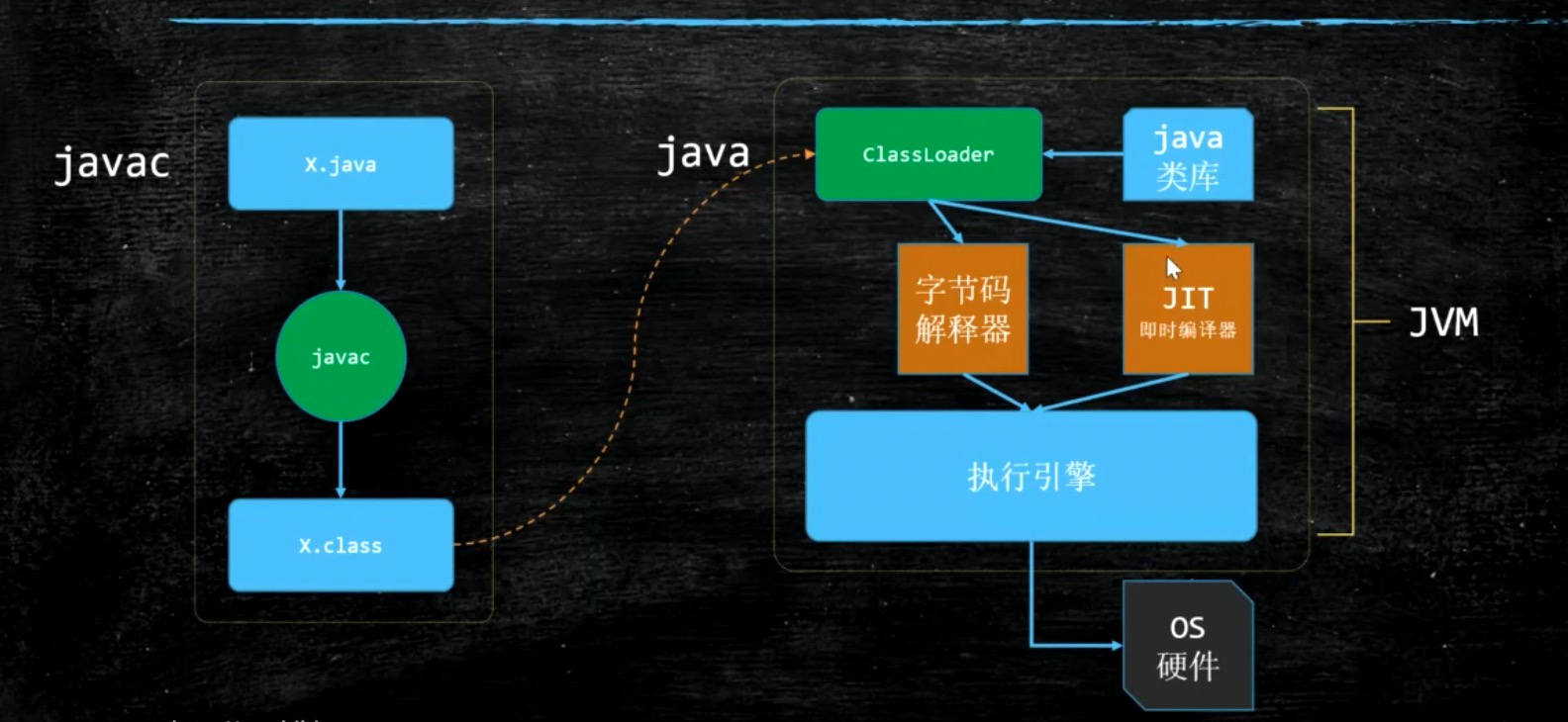 - .java文件经过编译器的编译后成为.class字节码文件,通过类加载器classloader加载到内存,然后通过字节码解释器解释或者即时编译器JIT编译,然后交给执行引擎进行执行,执行引擎再和os和硬件交互。