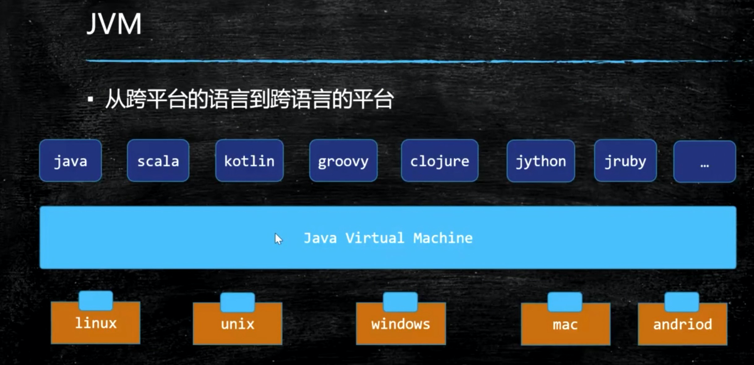 - jvm跟java无关:任何语言只要能编译成class文件都能在jvm上运行。