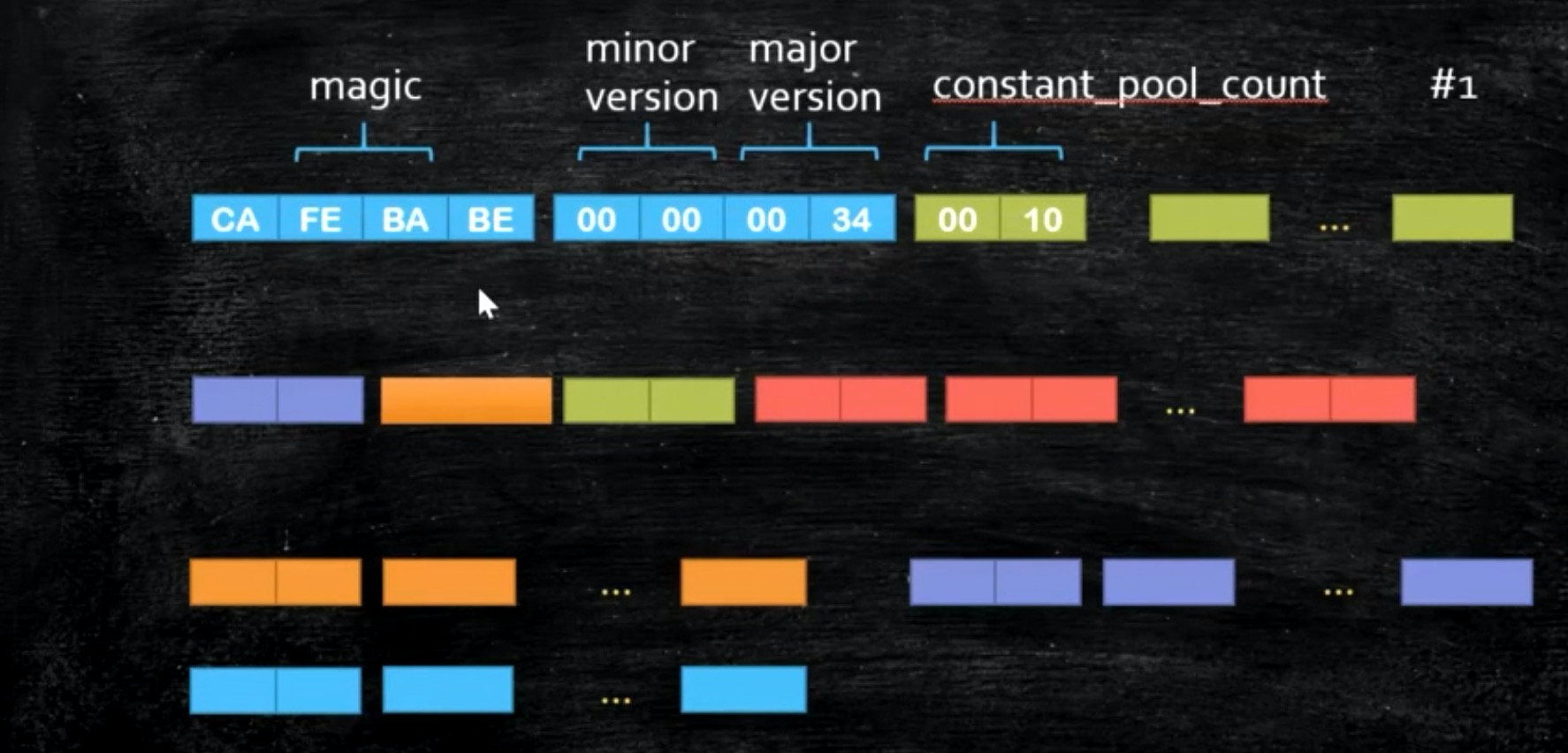 5-8个字节:00000034,0000这两个字节表示小版本号(minor version),0034这两个字节表示大版本号(major version)。(我是用jdk1.8编译对应的版本号用十进制表示为52.0)