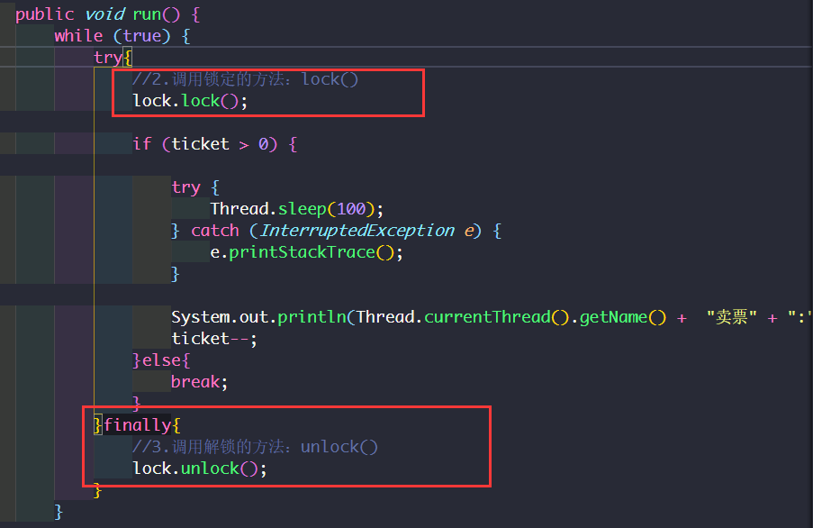 注意:其中调用lock()方法和unlock()方法时要用try()finally()包住