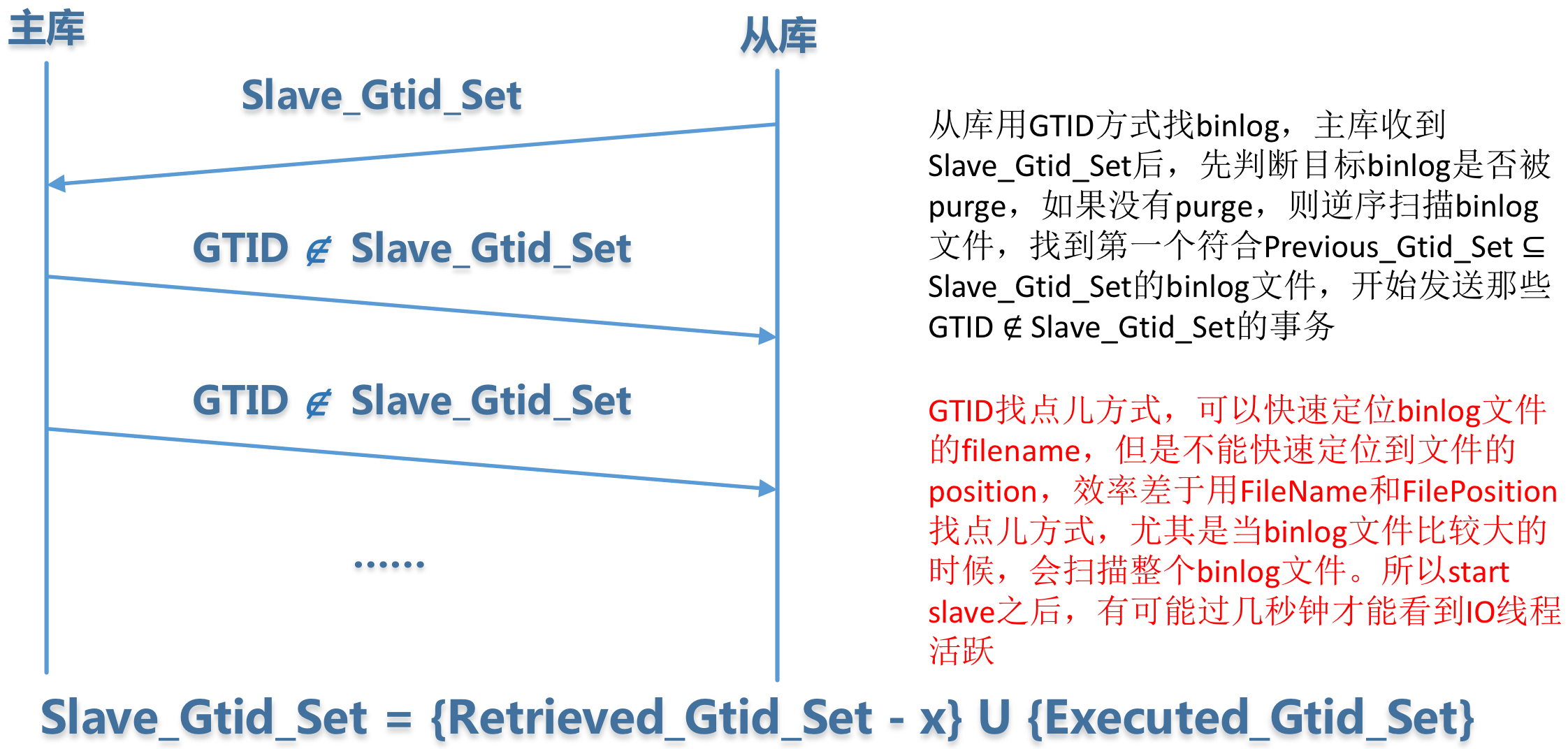 我们知道,在未开启GTID模式的情况下,从库用(File_name和File_pos)二元组标识执行到的位置。START SLAVE时,从库会先向主库发送一个BINLOG_DUMP命令,在BINLOG_DUMP命令中指定File_name和File_pos,主库就从这个位置开始发送binlog。
