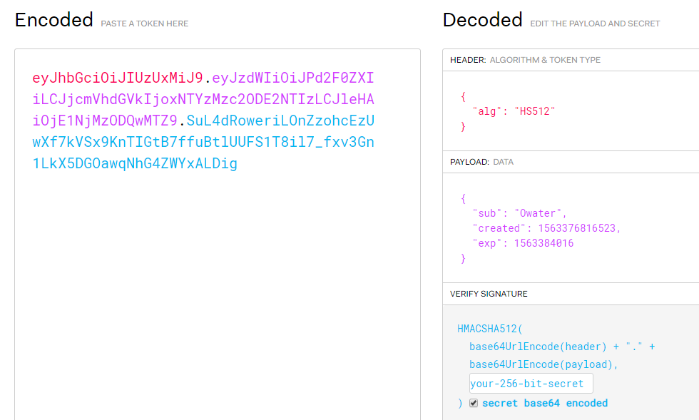 eyJhbGciOiJIUzUxMiJ9.eyJzdWIiOiJPd2F0ZXIiLCJjcmVhdGVkIjoxNTYzMzc2ODE2NTIzLCJleHAiOjE1NjMzODQwMTZ9.SuL4dRoweriLOnZzohcEzUwXf7kVSx9KnTIGtB7ffuBtlUUFS1T8il7_fxv3Gn1LkX5DGOawqNhG4ZWYxALDig