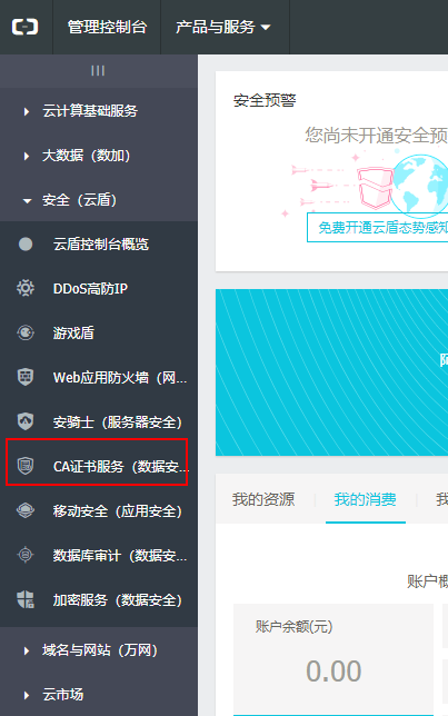 首先需要有一个阿里云账号。然后登陆到阿里云的网站,在控制台中找到 CA证书服务。如下图所示: