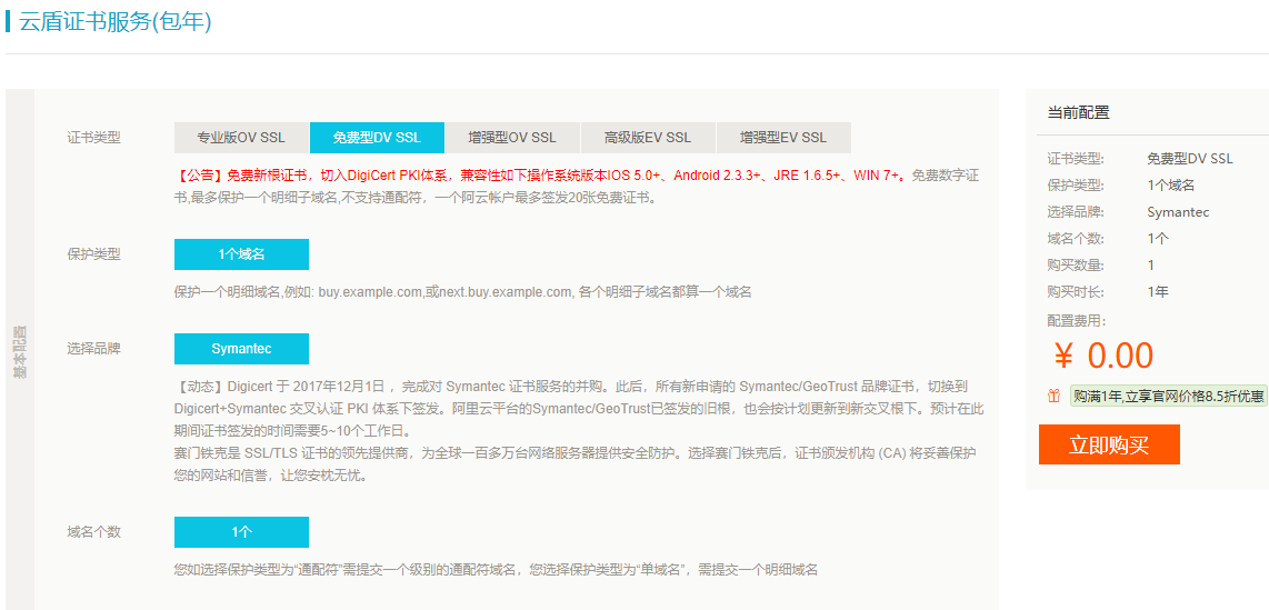 幸好为了推广 https 证书,国内的云服务厂商大多都提供了免费的 https 证书签发服务。当然是认证级别最低,覆盖范围最小的那种了。