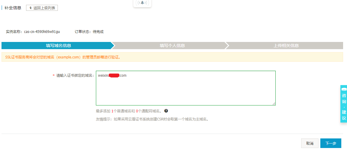 点击“立即购买”并且支付后,会在 CA 证书服务页面生成一个新订单。然后点击“补全”按钮补充信息。