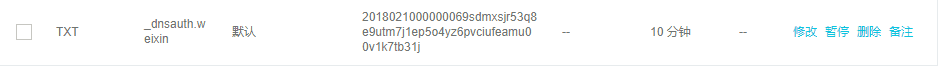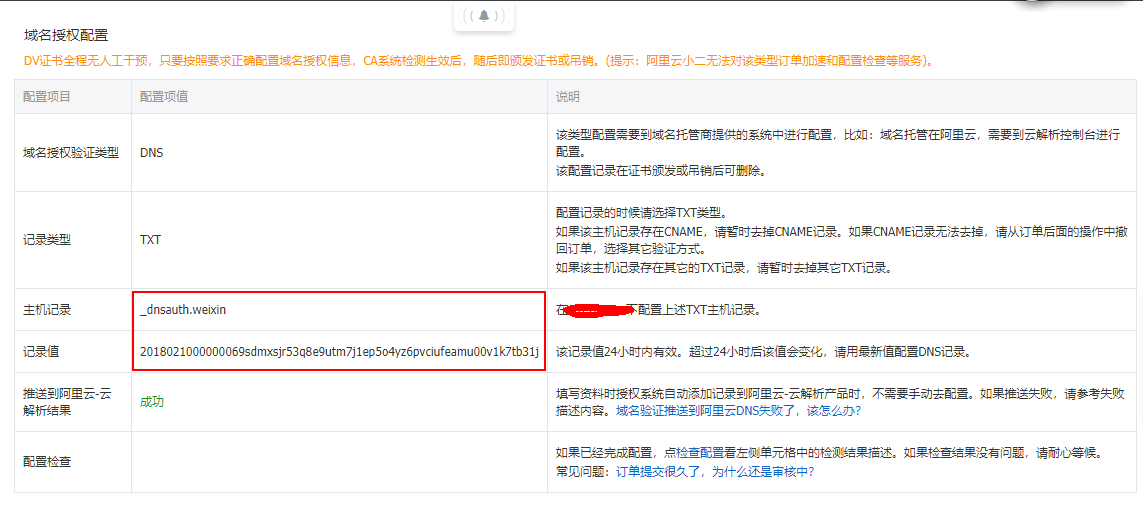 补全这些信息后,就等待系统自动审核通过。点击订单“详情按钮”可以看到证书验证需要在申请证书域名的解析中增加一条图中的 TXT 类型的解析记录来进行域名的验证。