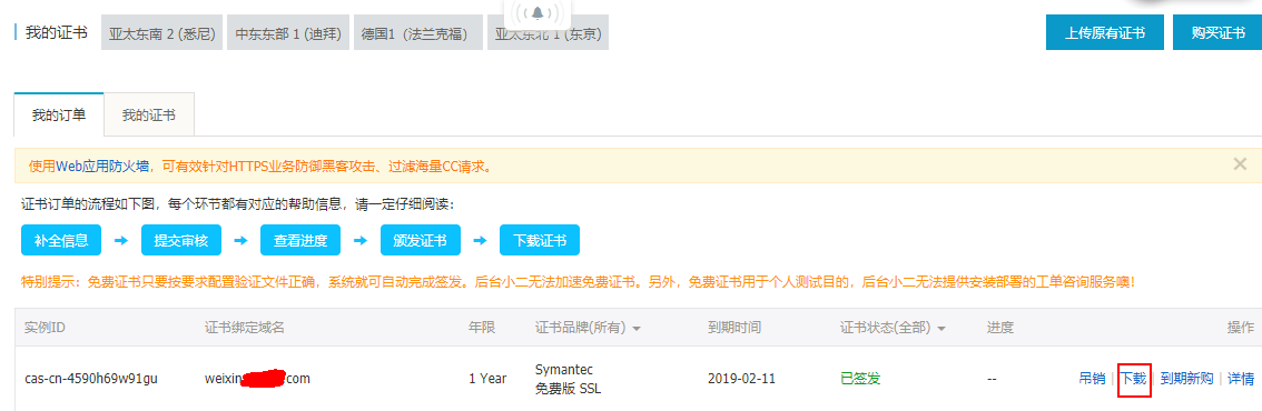 等待一段时间后,订单状态会显示为签发成功,表示证书已经签发成功了。