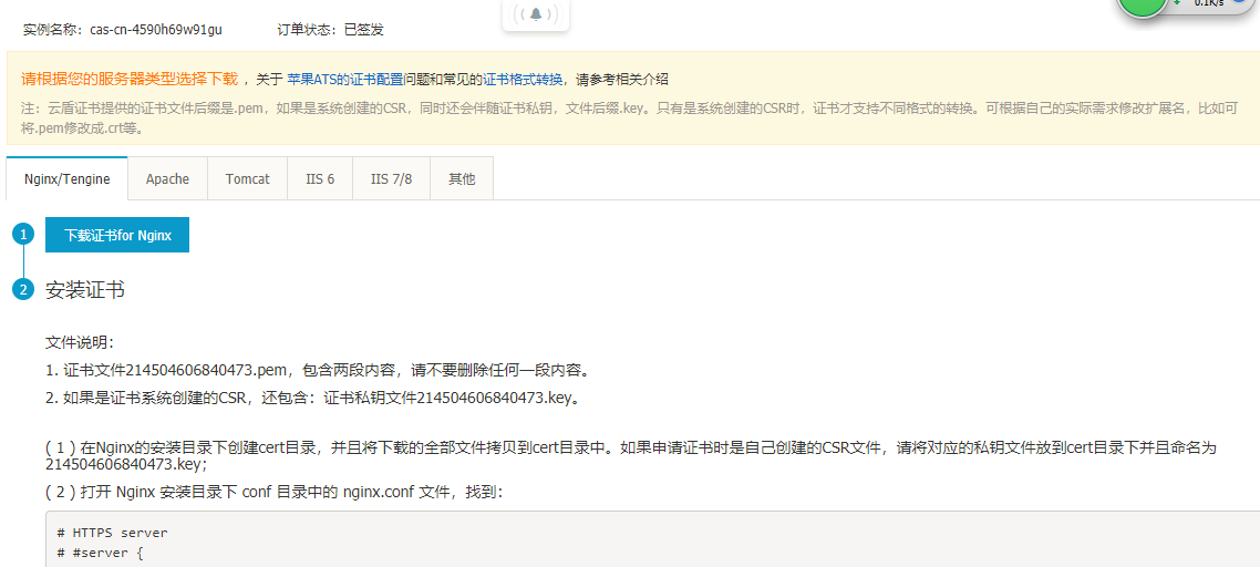 证书签发成功后,需要在 http web 服务器中配置证书。在上图中点击“下载” 按钮后,阿里云提供了下面几种 web服务器的配置样例