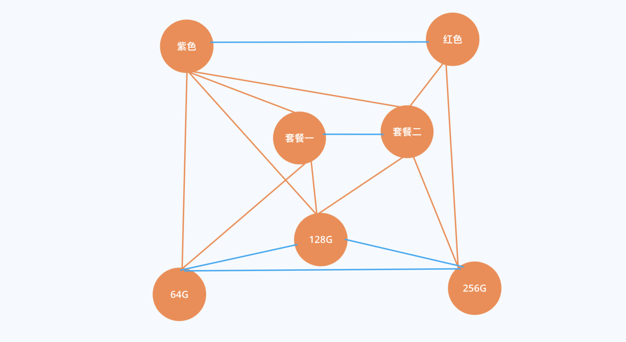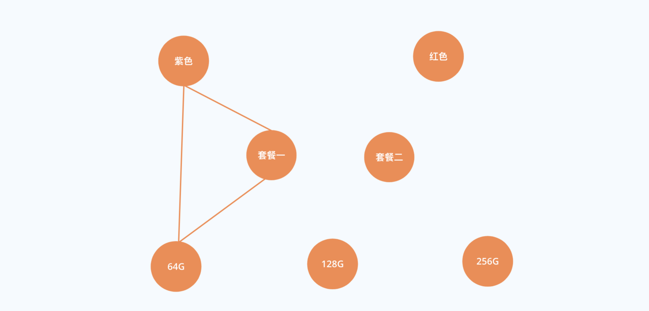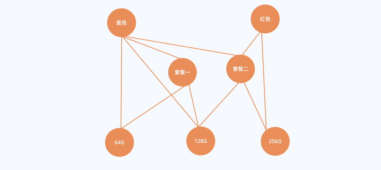 假设用户先选择了紫色、根据specCombinationList,我们发现套餐一、套餐二、64G、128G是可选的,这个时候我们发现一个问题:显然跟紫色同级的红色其实也是可选的。所以这个图其实我们还没有画完。所以相同类型的规格,只要是在可选规格里面的,他们其实是应该连接起来的: