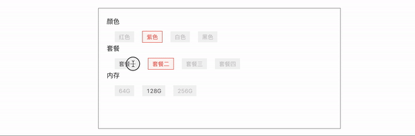 近来在掘金上面看见大家都在研究“商品多规格选择”的问题,例如晨曦大佬的前端电商 sku 的全排列算法很难吗?学会这个套路,彻底掌握排列组合。 在这篇文章里面,大佬写明了如何实现sku的全排列,思路非常的棒,但是并没有紧贴业务场景。真正的业务场景是,我们要根据用户每一次选择的规格,找出剩下可选的规格和不可选的规格,表现在前端页面上:就是将不可选的规格置灰,也就是如下效果(可以点击这里查看最终效果):