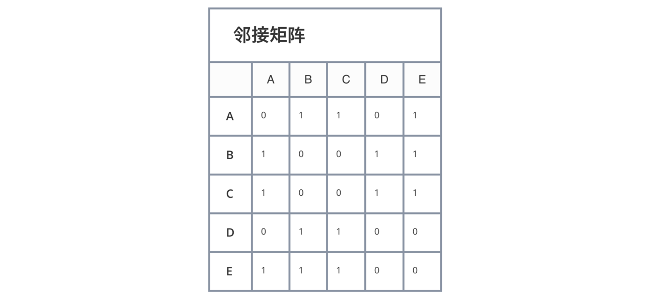 很显然,如果两个顶点互通(有连线),那么它们对应下标的值则为 1,否则为 0。