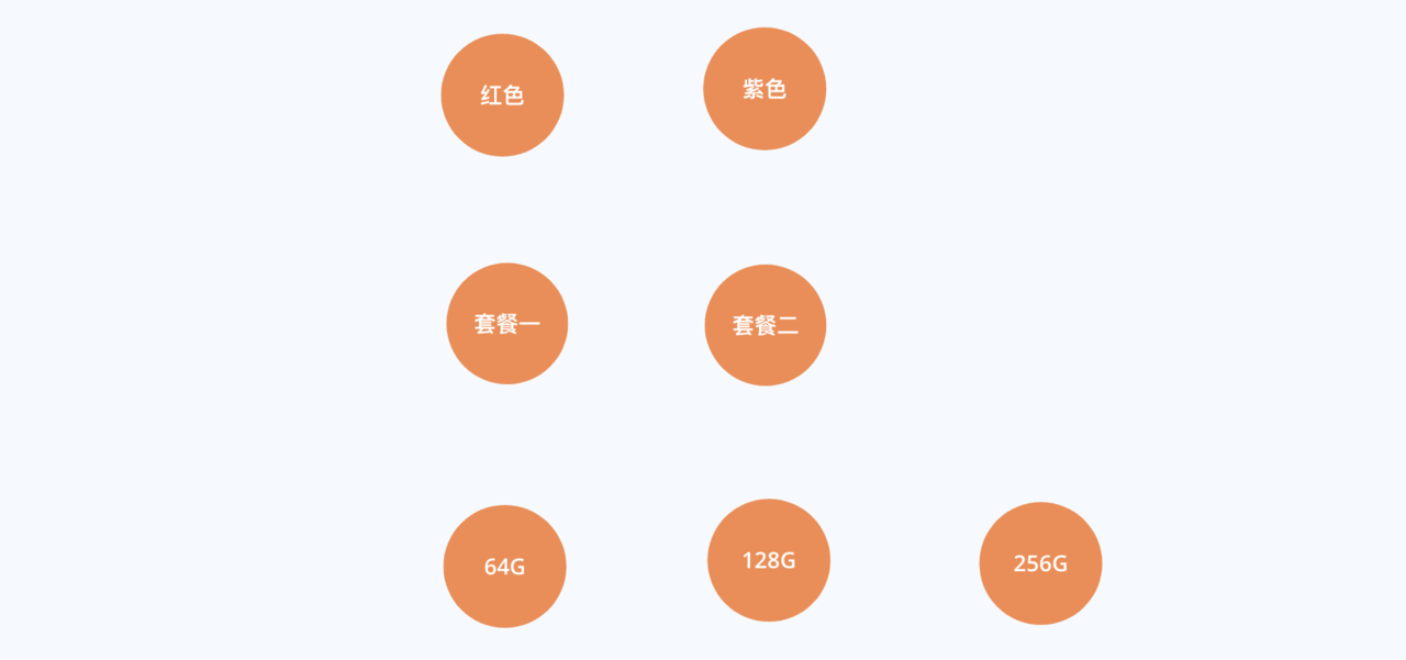 根据{ id: "1", specs: ["紫色", "套餐一", "64G"] },我们可以画出: