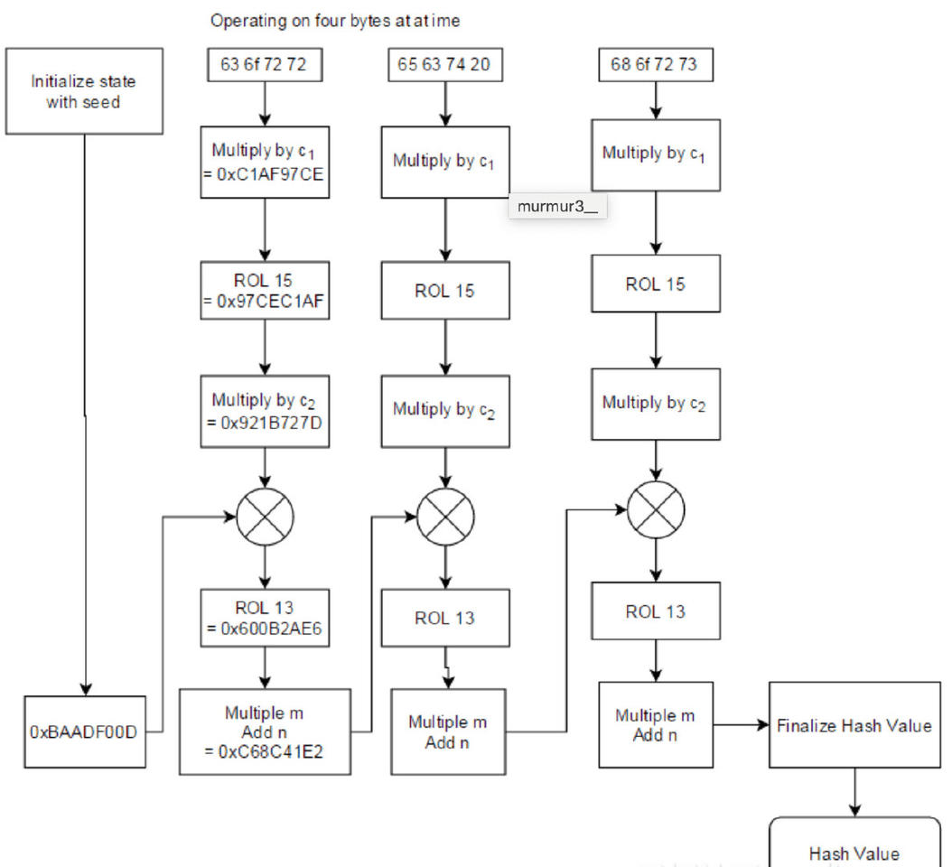 4、 Hash 函数使用 Murmur3,Murmur3 是非加密散列函数,不适用于加密目的,其流程和实现如下