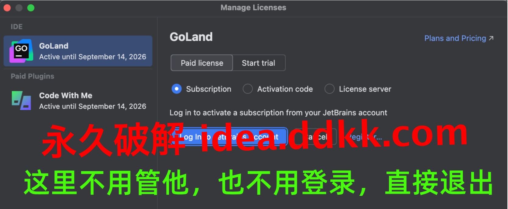 装完DataGrip之后,第一次启动会弹出一个登录界面,提示你要先登录JetBrains账号。这时候千万别急着登录,先点Exit退出,跟着教程继续往下走。
