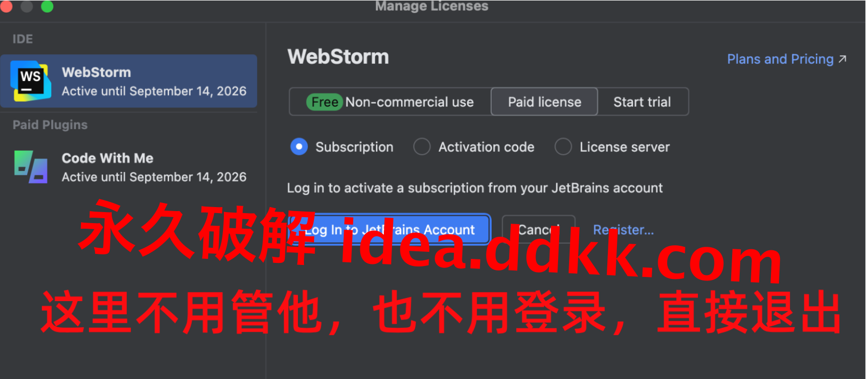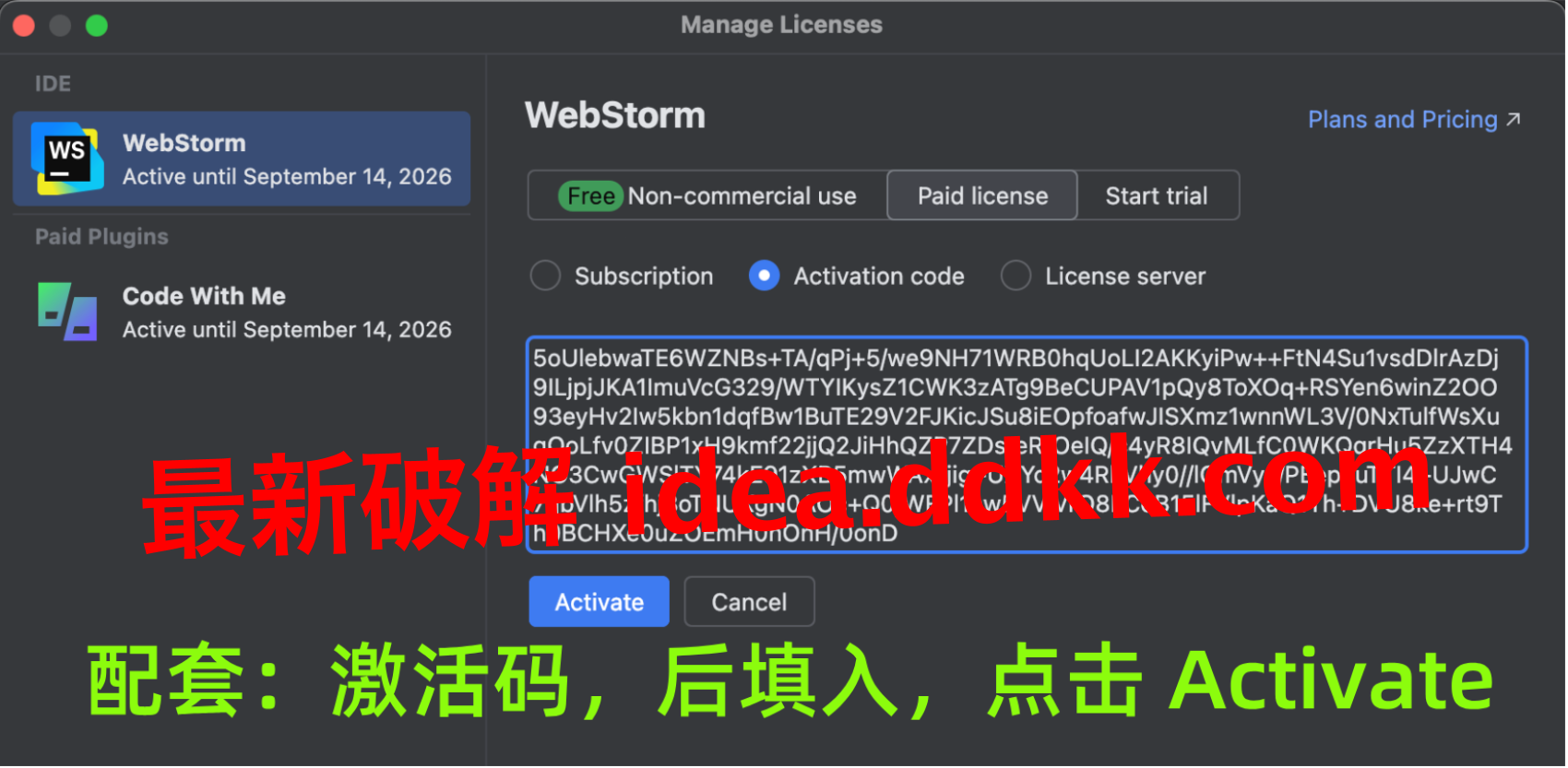 补丁装完了,接下来就是输激活码的环节。JetBrains 家的每个产品激活码都是独立的,WebStorm 有 WebStorm 的码,IDEA 有 IDEA 的码,别拿错了。