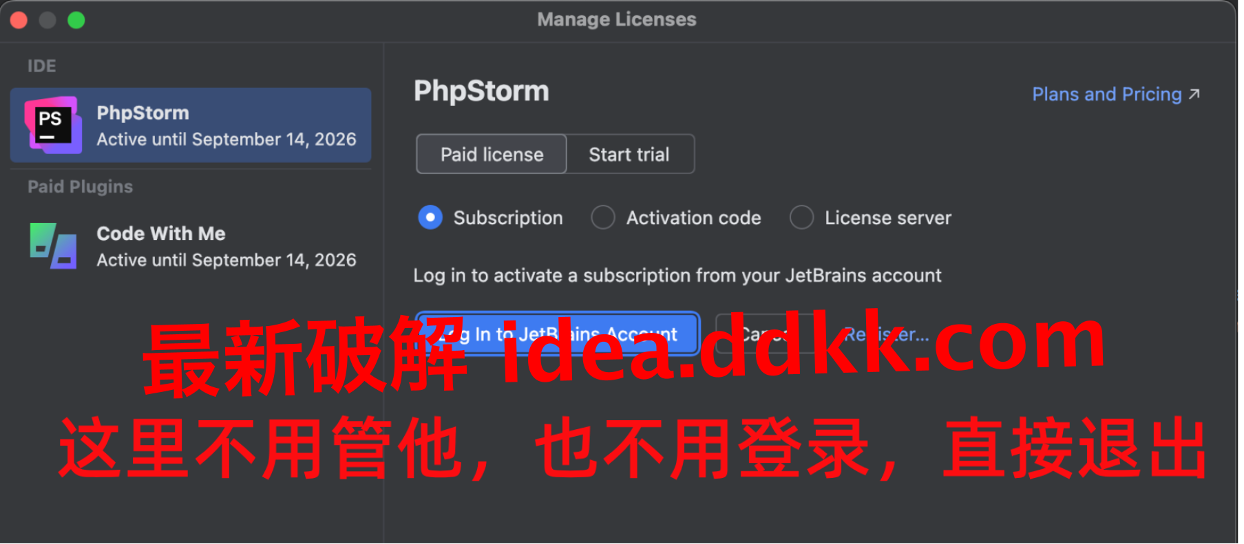 程序运行起来第一件事就是让你登录账号,这时候直接无视它,点 Exit 按钮退出 PhpStorm。补丁还没装呢,你登录干啥?