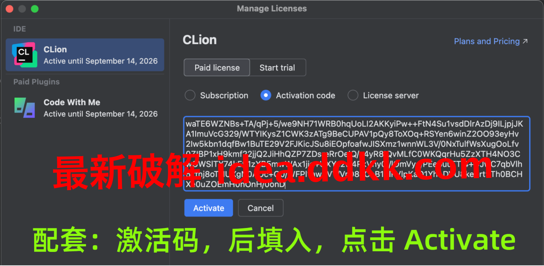 重新启动CLion后,会弹出激活界面。选择"Activate CLion",然后选择"Activation code",将对应的激活码复制粘贴进去。注意,CLion的激活码和其他JetBrains产品是不同的,不要搞混。