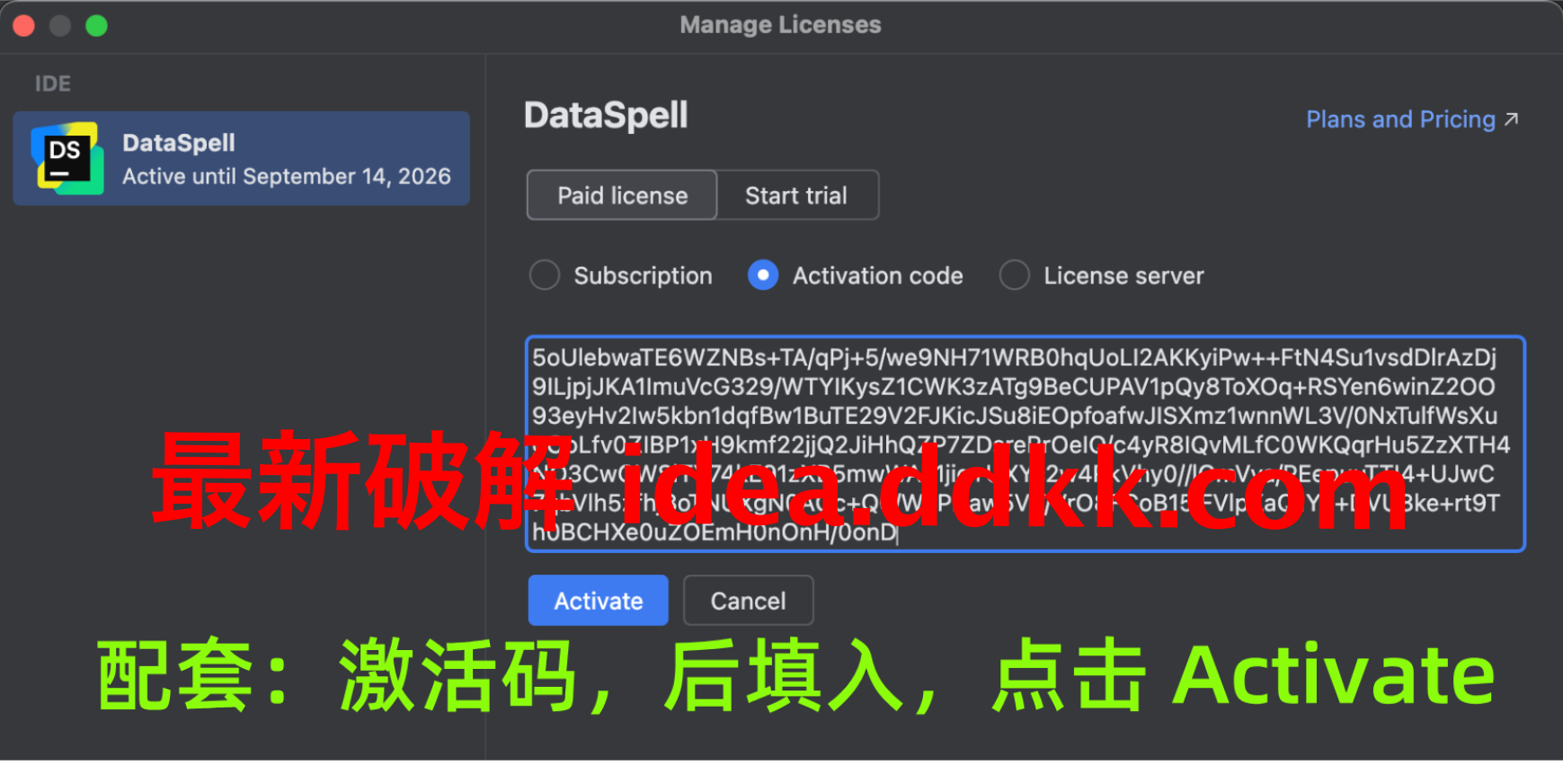 补丁安装完成之后,接下来就是输如激活码了;这里有个重要的提醒,JetBrains的每个产品对应的激活码都不一样,DataSpell有专门的激活码,不能用其他产品的激活码;如果你用错了激活码,会提示Key is invalid,那就得重新找对应的激活码了;输如的时候注意别复制错了,多检擦几遍