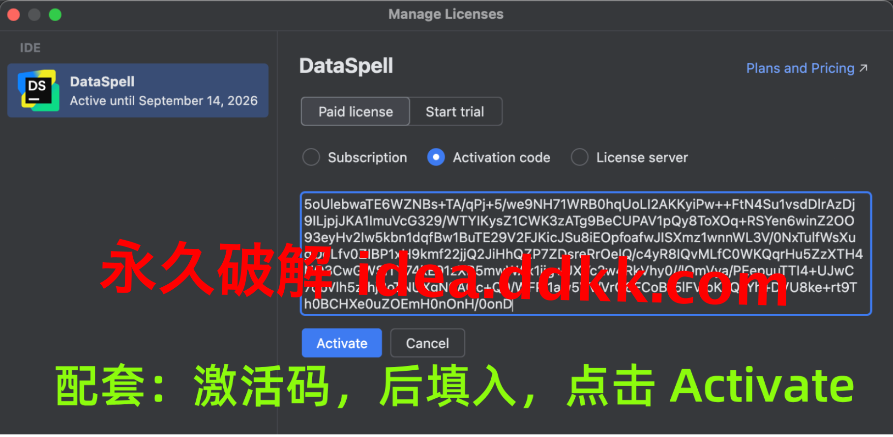 激活码怎么拿?看文章最后,关注公众号之后回复对应的关键词就能拿到;拿到激活码之后,打开DataSpell软件,找到Activation Code这个选项,把激活码复制粘贴进去就行了