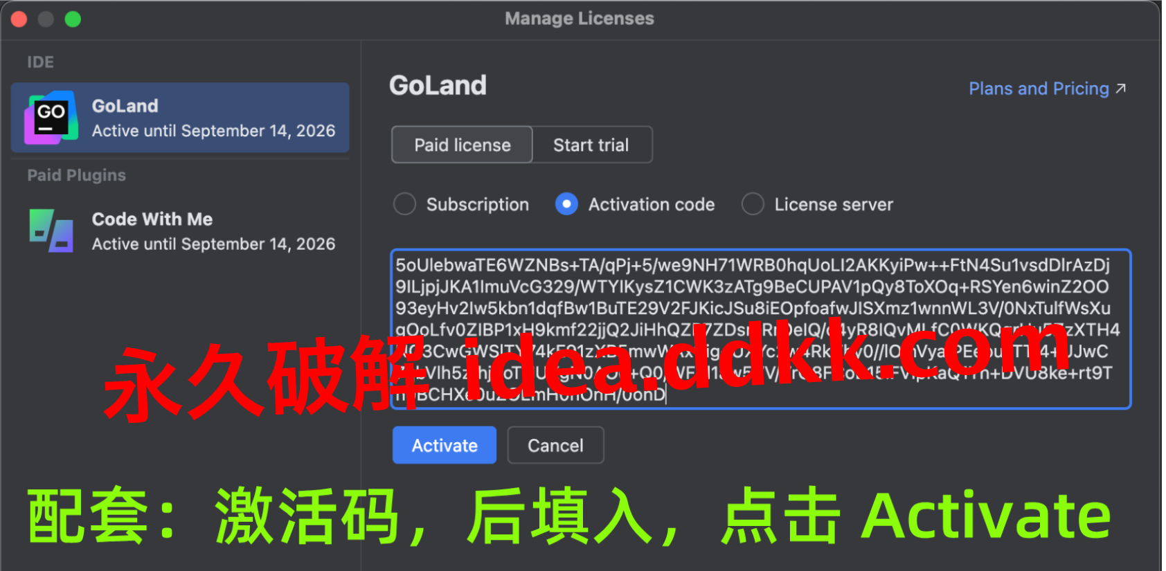 打开GoLand,选激活码激活方式,把对应的激活码复制进去。补丁装好后,注意,GoLand的激活码跟其他JetBrains产品不一样,别用混了。激活码在上面那个链接里能找到,选GoLand对应的就行。