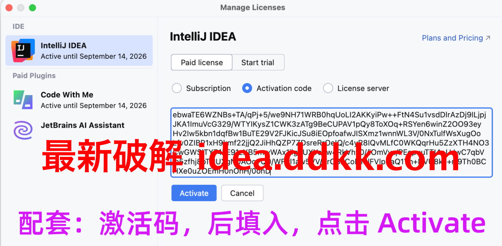 打开IDEA,找到激活选项,选择激活码激活,然后把IDEA对应的激活码复制进去。激活码我鹏磊放在文章最后了,你们自己去拿。别用错了,IDEA有IDEA的码,PyCharm有PyCharm的码,别搞混了。