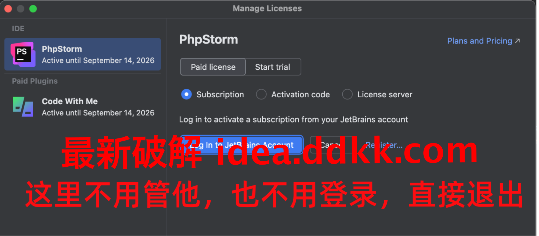 装完PhpStorm后,第一次启动会弹出登录界面,让你登录JetBrains账号;这时候千万别急着登录,很多兄弟看到这个界面就手痒,想赶紧登录进去试试,结果登录完就激活不了了