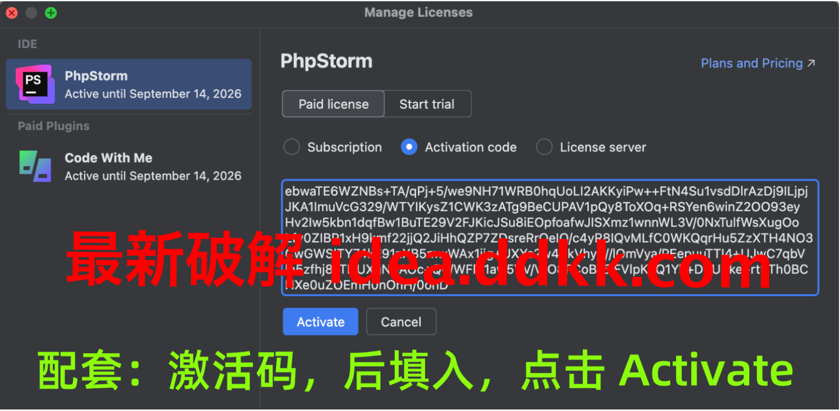 补丁装好后,接下来就是输入激活码了;我鹏磊得提醒大家,JetBrains每个产品的激活码都不一样,PhpStorm有PhpStorm的激活码,IDEA有IDEA的激活码,别搞混了;上面链接里有所有产品的激活码,大家按自己用的软件选对应的就行