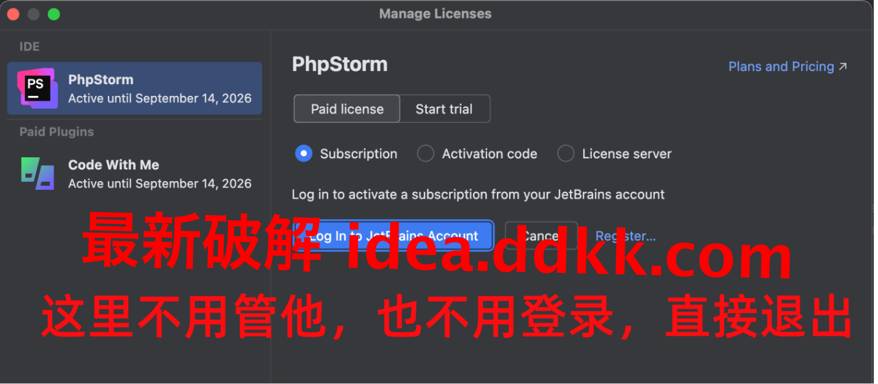 破解完的PhpStorm 2026.1,授权界面长这样,跟正版订阅用户看到的是同一个页面: