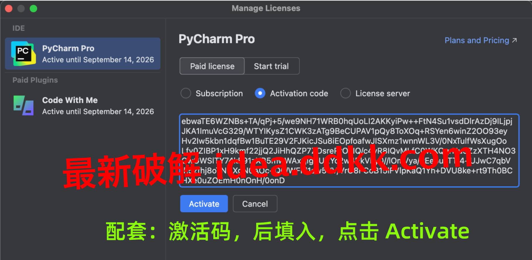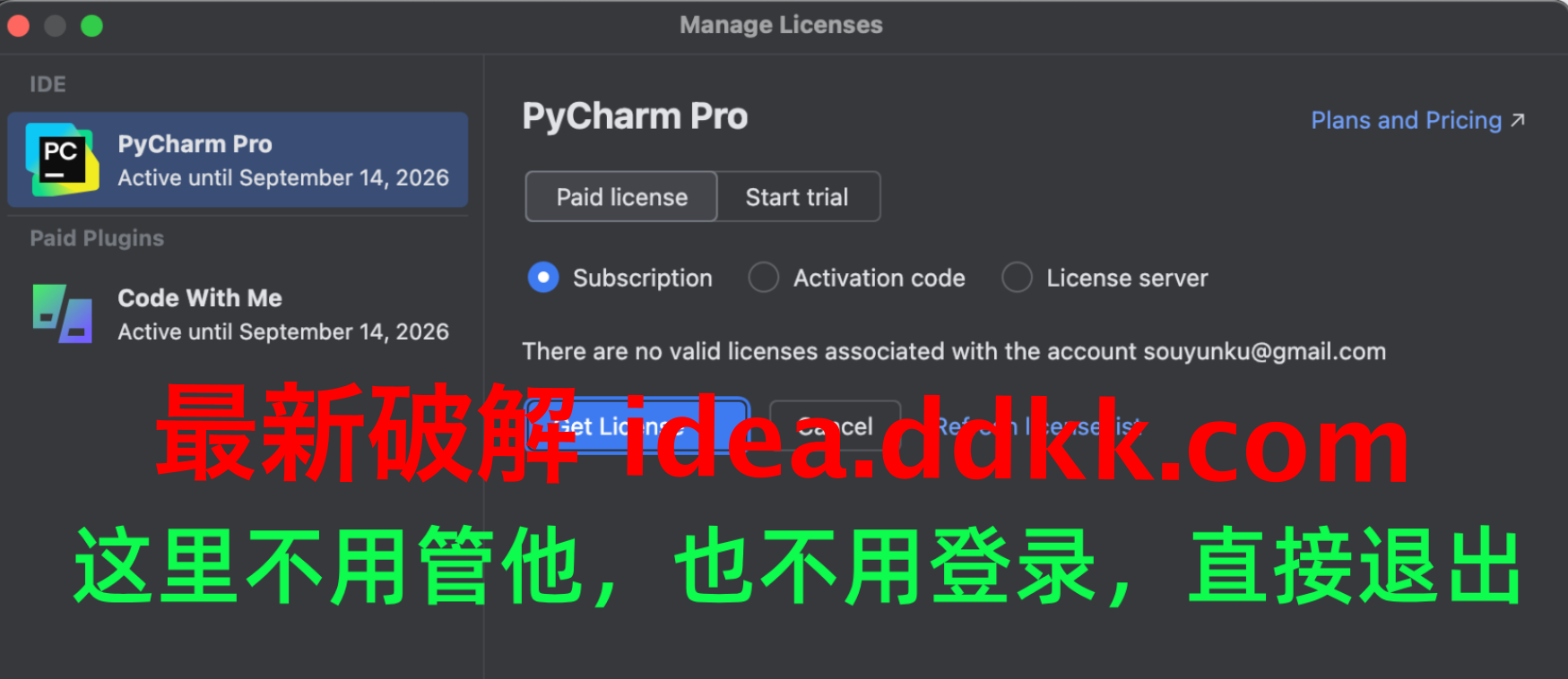 补丁安装完成后,接下来就是激活码环节;我鹏磊告诉你们,JetBrains每个产品都有自己独立的激活码,所以千万不要搞混;PyCharm有PyCharm的激活码,IDEA有IDEA的激活码,不能互相混用。